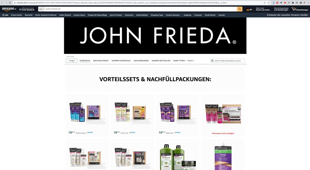 John Frieda ist die Premium-Haarpflege in Drogerien. Online sind diese exklusiven Produkte im John Frieda Amazon Shop erhältlich. Speziell für Amazon wurden Vorteilspacks zusammengestellt, die nicht nur eine komplette Haarpflege garantieren sondern auch einen Preisvorteil bieten. Die hochwertigen Verpackungen sind umweltfreundlich aus naturbelassenem Karton gefertigt und durch eine farbige Banderole akzentuiert. Das Design der Banderole repräsentiert die Markenwelt von John Frieda, präsentiert die Produkte und hebt durch eine prägnante Headline deren Vorzügen hervor.