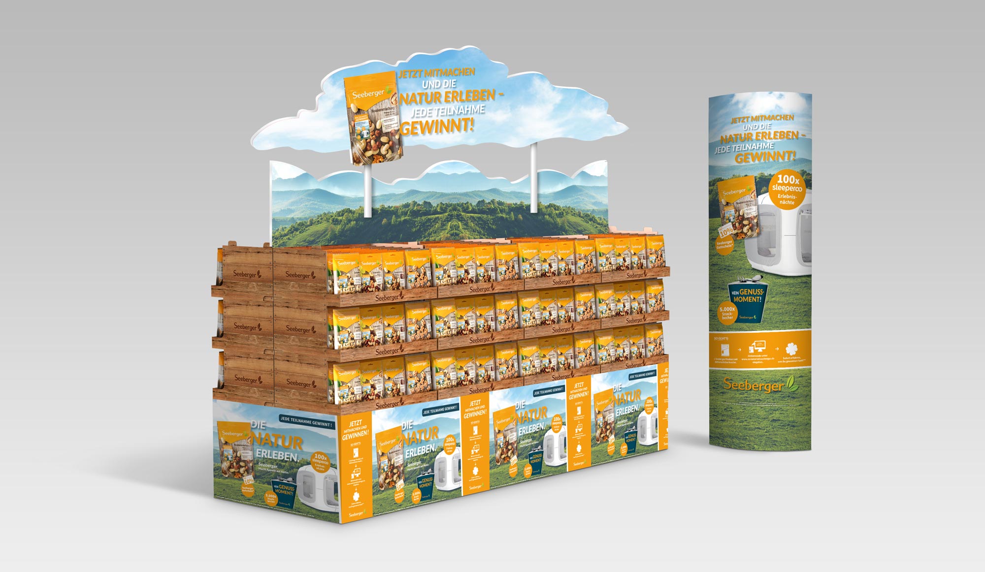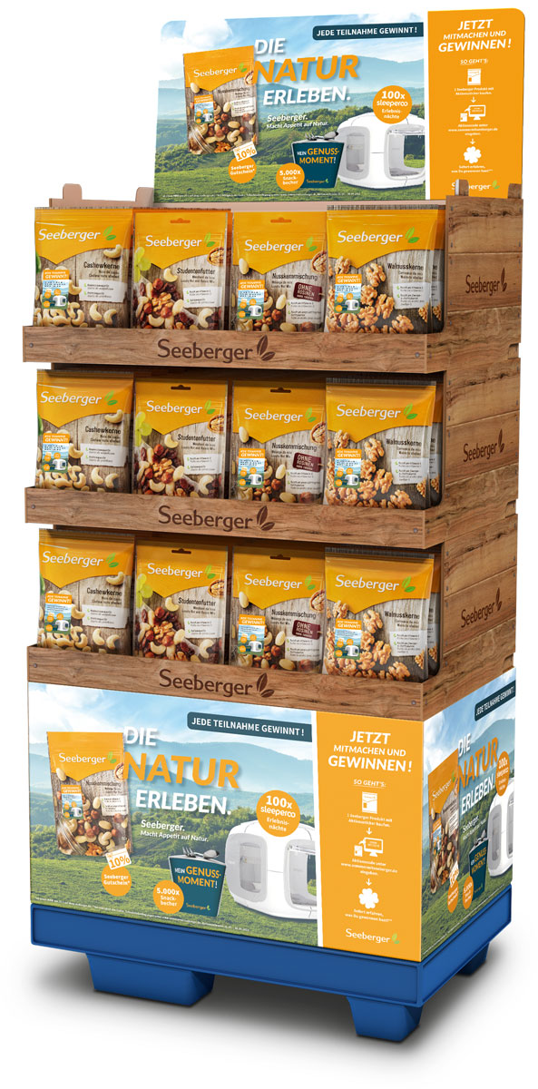 Attraktive Gewinne, die das Thema Natur authentisch mit Seeberger Produkten verknüpften, sorgten für starke Customer Response und hohe Teilnahmequoten. Eine sorgfältig abgestimmte Staffelung der Gewinne trug ebenfalls zum Erfolg der Promotion bei. Eine große POS Platzierung mit Modulcharakter war Anziehungspunkt für Shopper im Markt und zentrales Element der Abverkaufsunterstützung.
