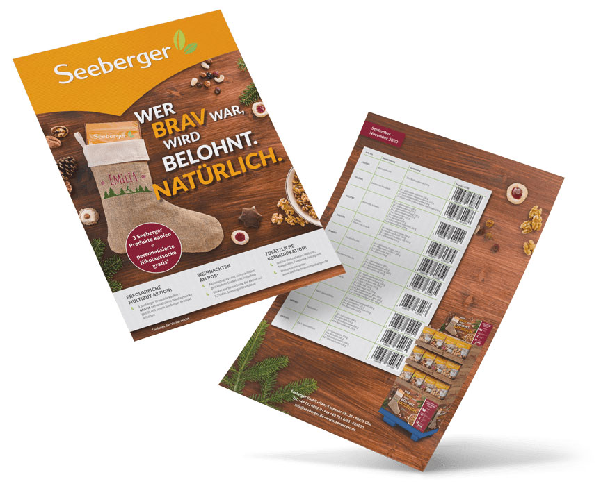 Besondere Grüße zum Fest ermöglichten wir mit der Weihnachtspromotion der Marke Seeberger für alle treuen Seeberger-Konsumenten. Hier brachten personalisierte Weihnachtssocken mit Seeberger-Produkten gefüllt nicht nur Kinderaugen zum Leuchten. Für diese saisonale Multibuy-Aktion entwickelten wir die konzeptionelle Idee und Mechanik, sämtliche Sell-In-Materialien und sorgten für eine reibungslose Kooperation mit YourSurprise.de
